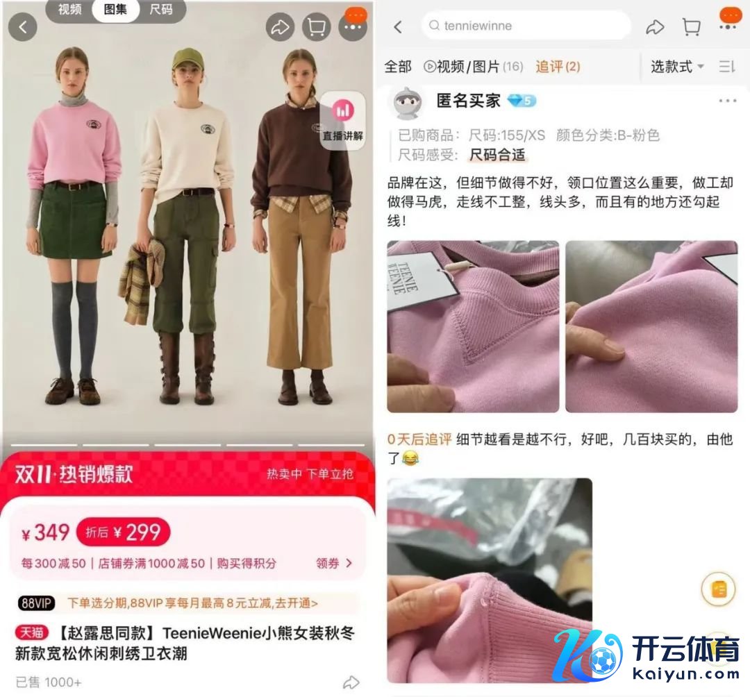 TeenieWeenie最为各人熟知的经典产物,如小熊卫衣,价钱下来了,口碑却不如从前。在天猫TeenieWeenie官方旗舰店销量第一的卫衣商酌区,有花费者暗示:“品牌在这,但细节作念得不好,领口位置这样进犯,作念工却恣意,走线不工致,线头多,有的场所还勾丝。”