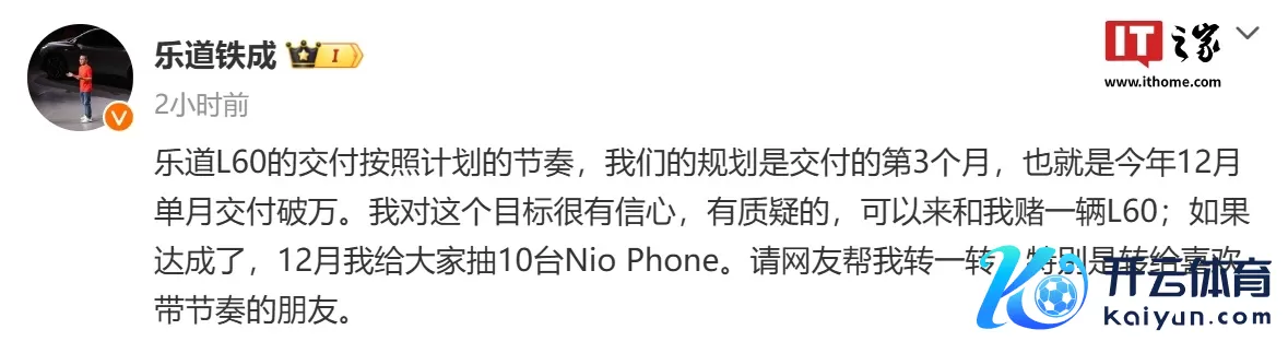 IT之家 11 月 27 日音问,乐谈汽车总裁艾铁成本日在微博发文,称乐谈 L60 的委派按照贪图的节律,咱们的议论是委派的第 3 个月,也等于本年 12 月单月委派破万。