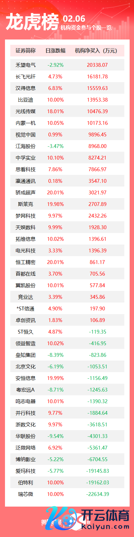 2月6日龙虎榜中,共38只个股出现了机构的身影,23只股票呈现机构净买入,15只股票呈现机构净卖出。当天机构净买入前三的股票分离是禾望电气、长飞光纤、汉得信息;当天机构净卖出前三的股票分离是瑞芯微、伯特利、爱玛科技。